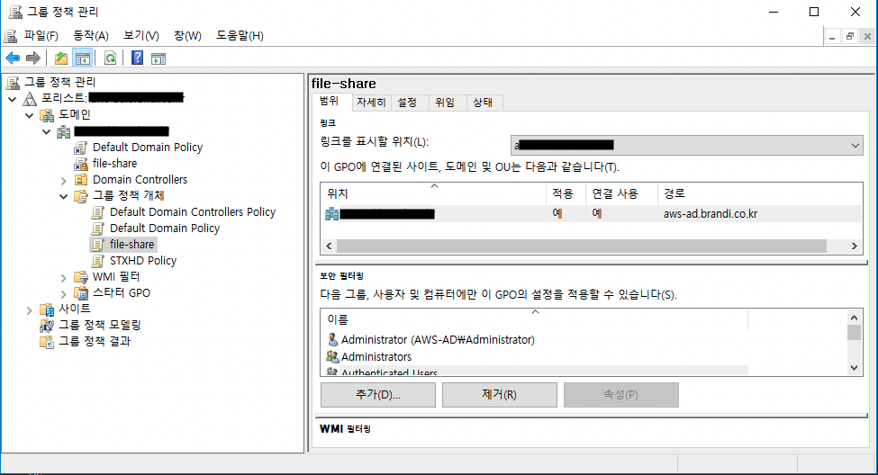 그룹 정책 관리 - 포트리스: aws-ad.brandi.co.kr - 도메인 - aws-ad.brandi.co.kr - 그룹 정책 개체 - file-share 우클릭 - 편집