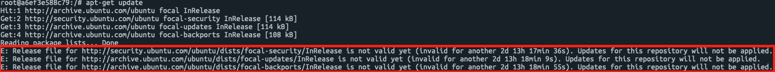 E: Release file for http://archive.ubuntu.com/ubuntu/dists/focal-backports/InRelease is not valid yet (invalid for another 2d 13h 18min 55s). Updates for this repository will not be applied.