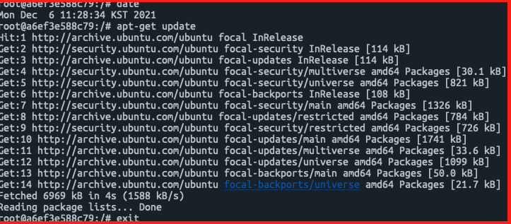 시간동기화를 한뒤에 다시 컨테이너에 접근해서 #apt-get update 명령어를 치면 정상적으로 작동한다.