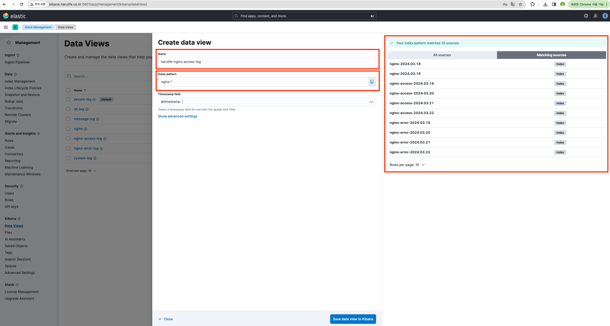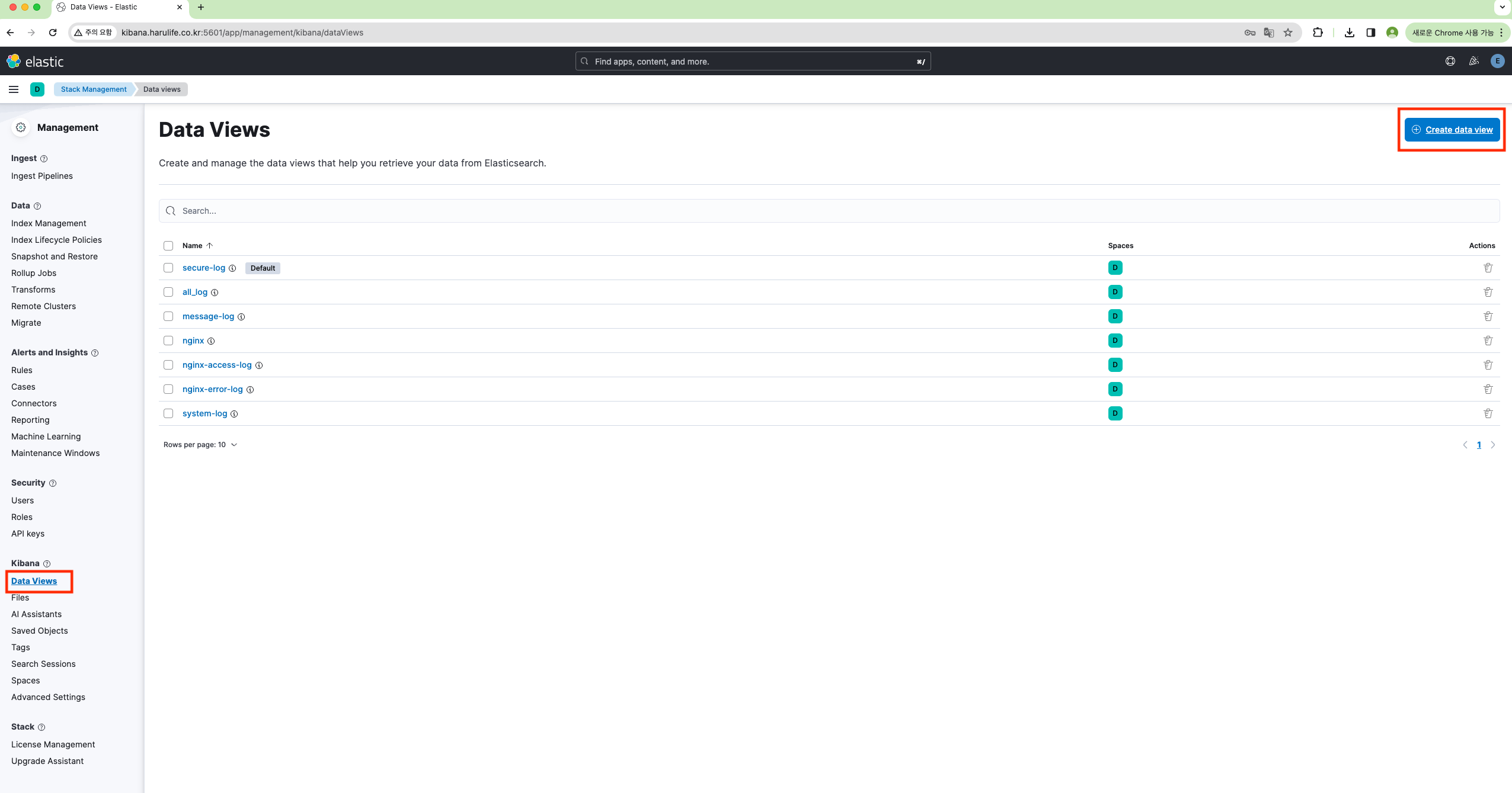 Kibana쪽 Data views 선택 및 Create data view 선택